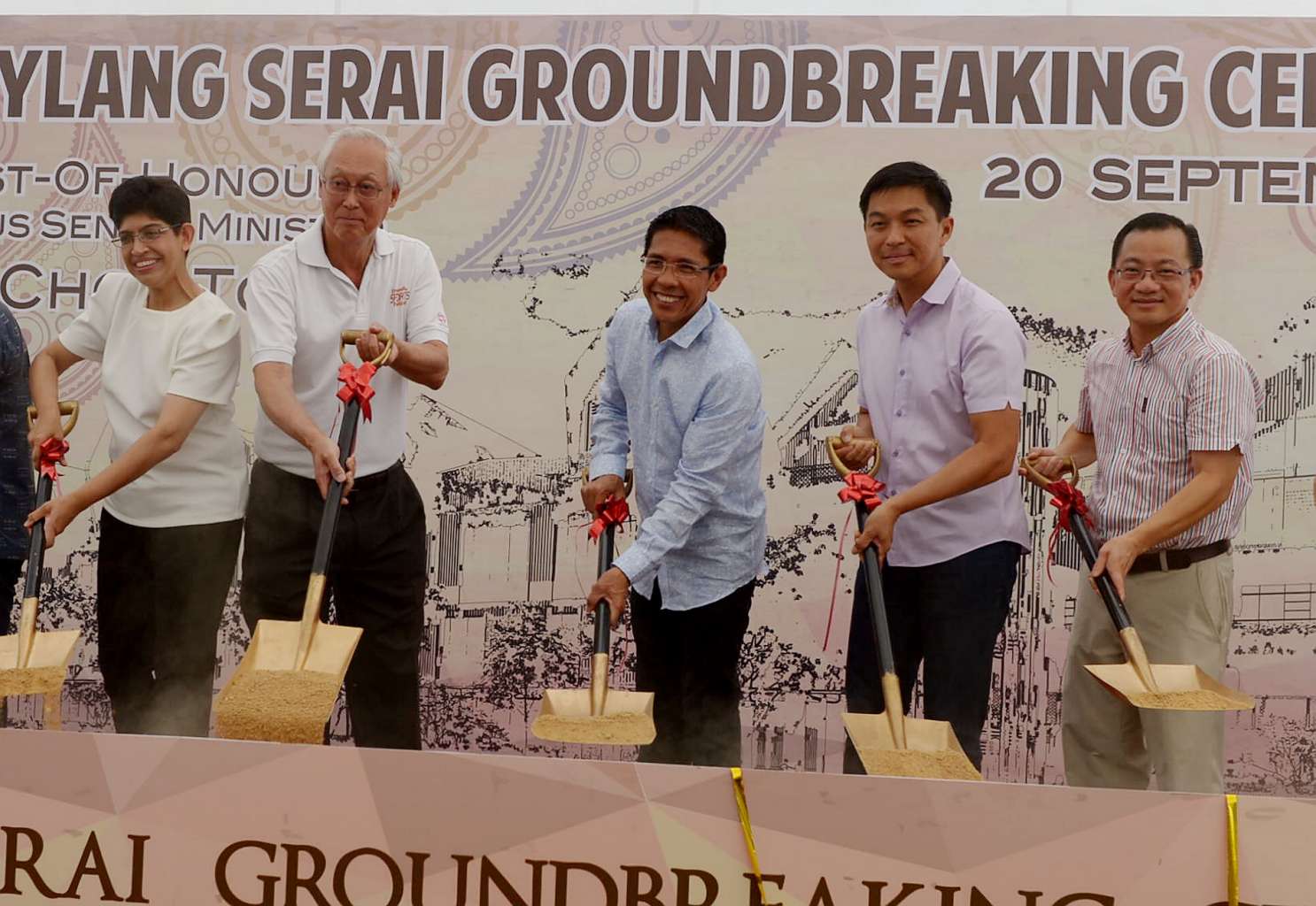 (From left) Associate professor Fatimah Lateef, ESM Goh Chok Tong, Dr Maliki Osman, Mr Tan Chuan-Jin and Mr Seah Kian Peng at the ground-breaking ceremony for Wisma Geylang Serai, which will open in 2018.