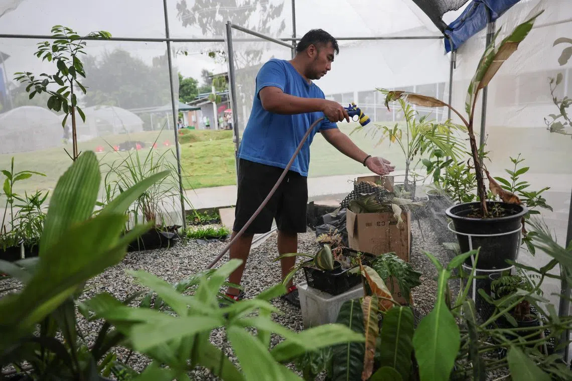Civil servant Dan Umar watering his plants in a greenhouse plot he rents and shares with a friend at City Sprouts @ West Coast.