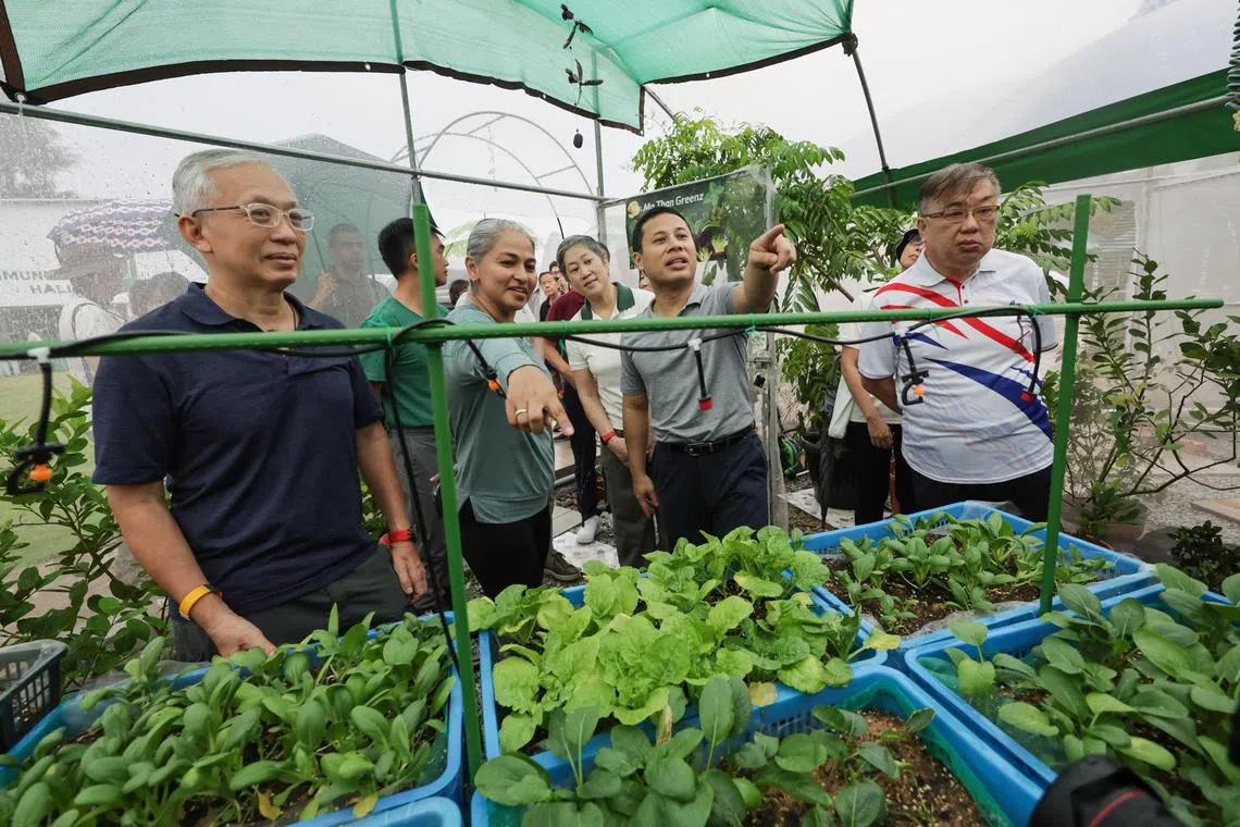 National Development Minister Desmond Lee (second from right) touring one of the greenhouse plots at City Sprouts @ West Coast.
