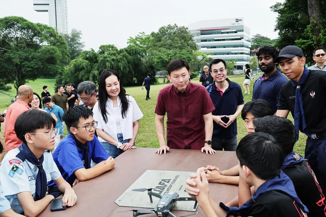 Minister for Transport and Second Minister for Finance Chee Hong Tat (centre) and adviser for West Coast GRC Grassroots Organisations Rachel Ong (in white) with scouts at a workshop introducing unmanned aircraft.