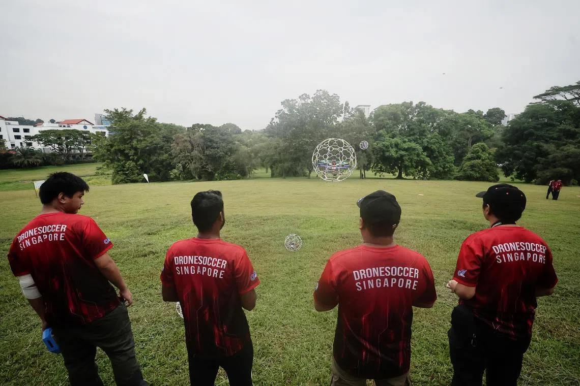 Members of Drone Soccer Singapore flying drone balls at the Unmanned Aircraft Flying Area at Dover Hiking Trail on July 6.