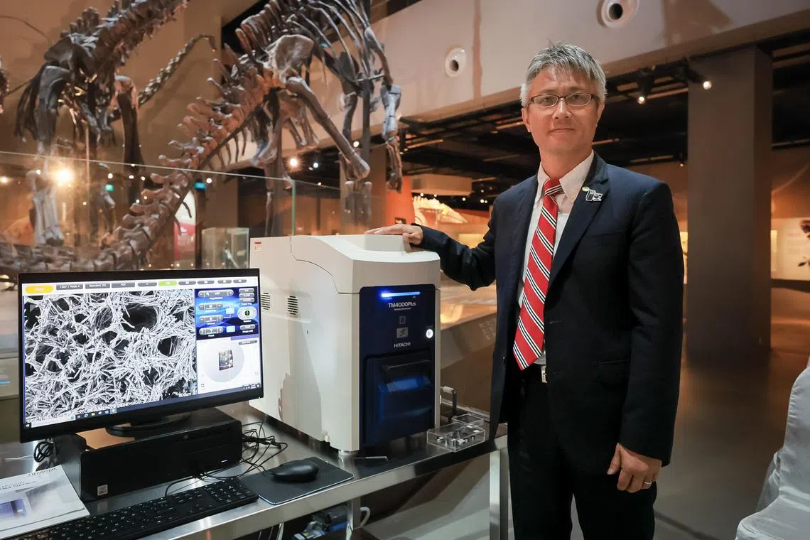 Mr Hidehiro Yamada, managing director of Hitachi High-Tech Malaysia, with Hitachi’s TM4000Plus II tabletop scanning electron microscope at the preview of the Nature Remixed exhibition.