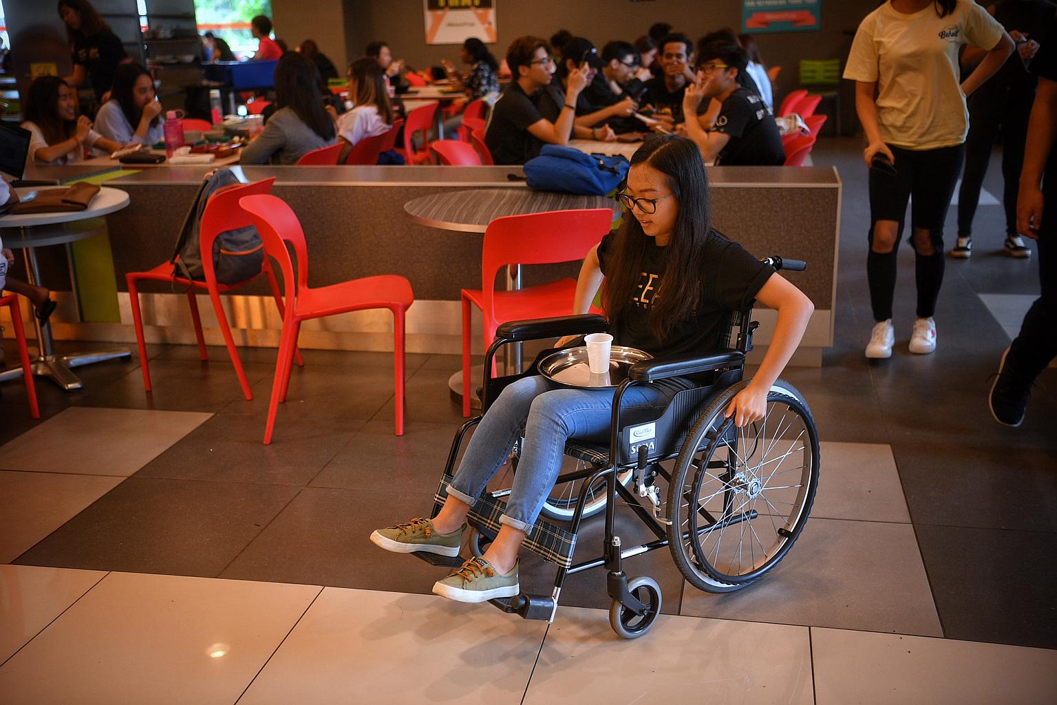 Business student Celine Lee balances a tray of water as she tries navigating around in a wheelchair during a campaign to encourage a more inclusive and respectful campus, and better integrate students with special educational needs and disabilities.