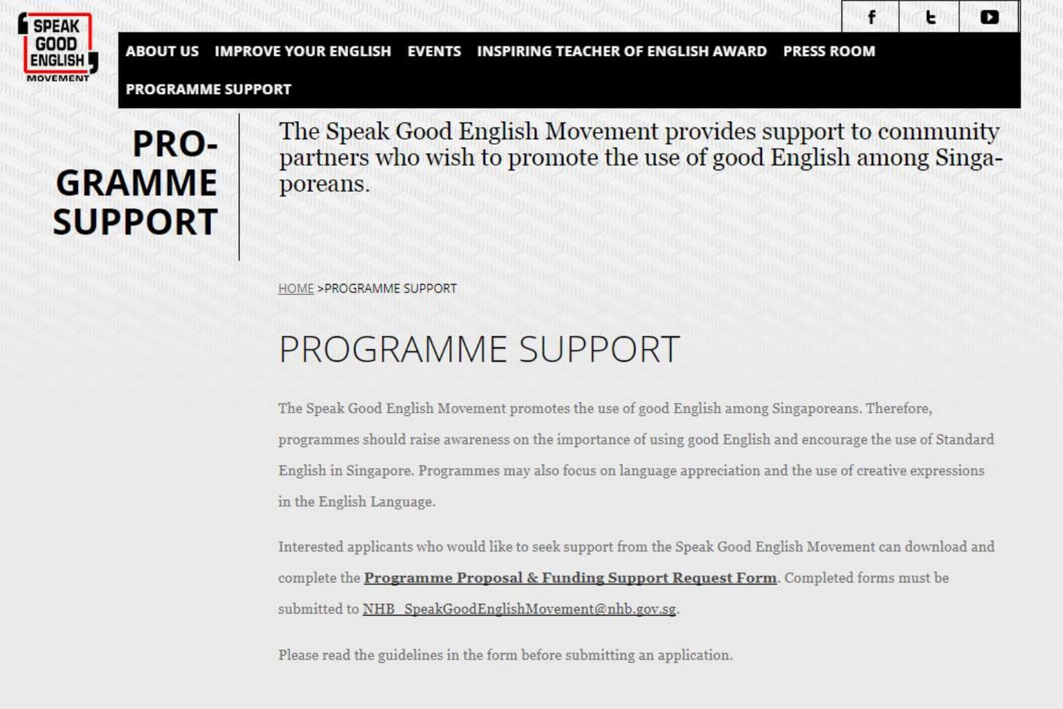 Applicants can download the programme proposal and funding support request form from http://goodenglish.org.sg/programme-support