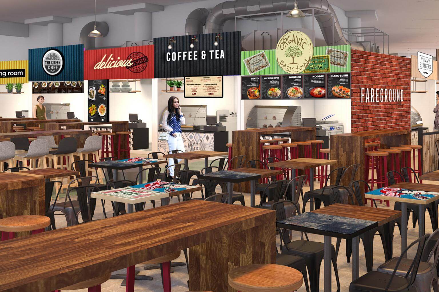 Artist impressions of the second floor of the Pasir Ris Central Hawker Centre, which will have traditional hawker food on the ground floor and hipster cafe food on the second floor to appeal to new-generation hawkers and the younger crowd.