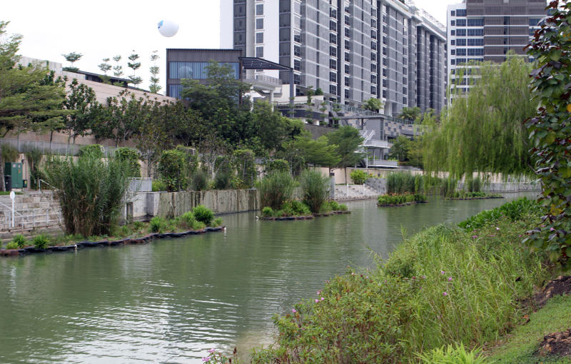 Dragonfly ponds to attract insects which eat mosquitoes. Spaces set aside for community farms. Greenery planted to reduce noise and provide relief from the heat.
