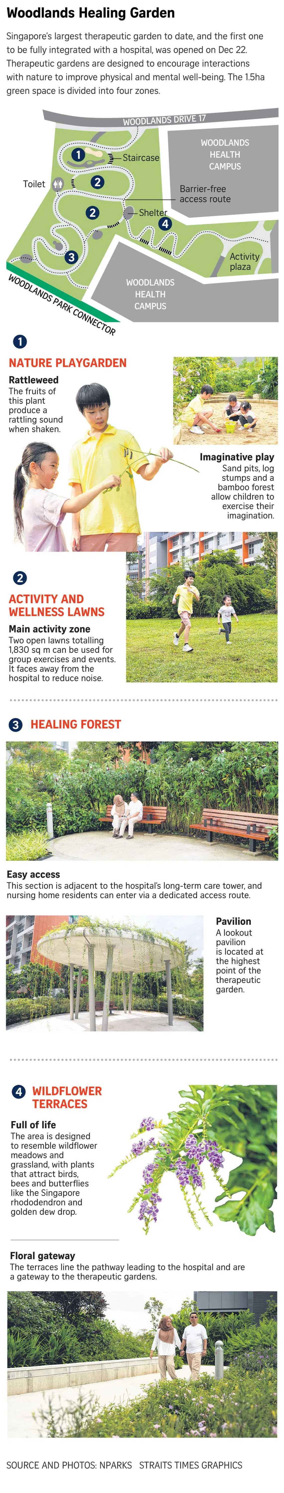 The 1.5ha Woodlands Healing Garden was designed by the National Parks Board in consultation with the hospital.