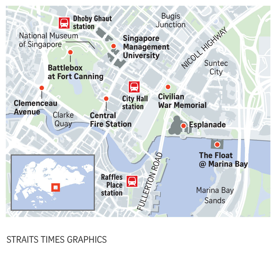 These are the Battlebox bunker in Fort Canning, Central Fire Station, Esplanade, Civilian War Memorial, Singapore Management University, Marina Bay floating platform and Clemenceau Avenue.