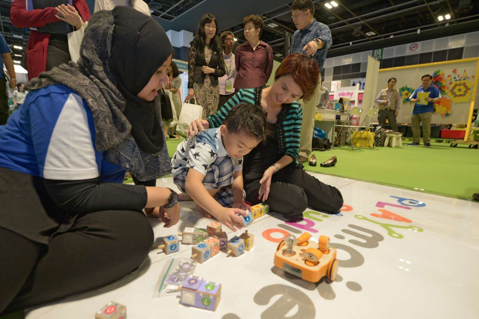 Parliamentary Secretary, Ministry of Education and Ministry of Trade and Industry, Ms Low Yen Ling and six-year-old Teo Cheng Wei (centre), playing Kibo, a robot programmed to move according to action commands during the Early Childhood Conference 2016.