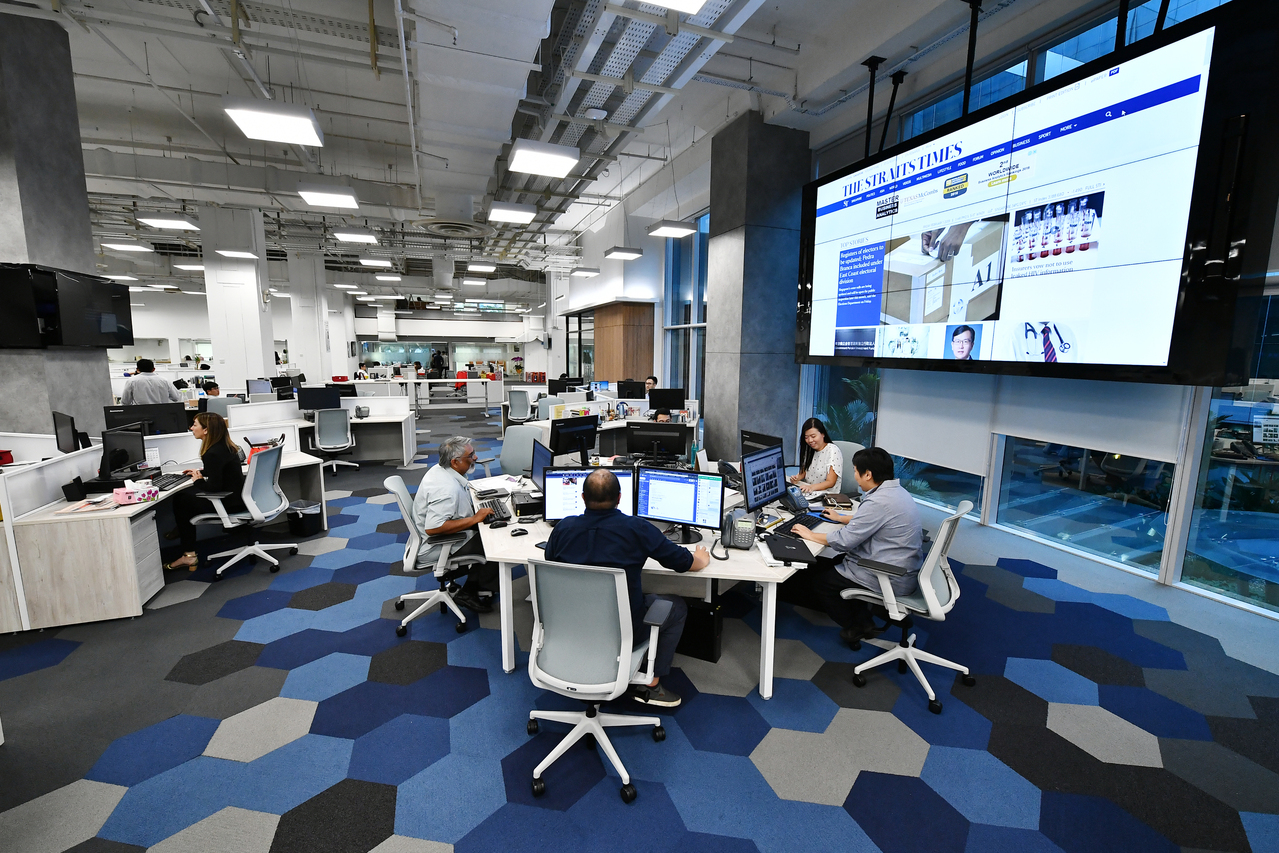 Mr Paul Jacob (second from left) at ST newsroom’s central hub, where the key editors of all the sections are stationed, on Feb 1, 2019.