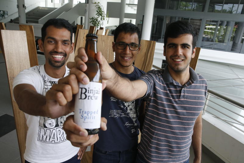(From left) NTU engineering students Rahul Immandira, Abilash Subbaraman and Heetesh Alwani, founders of Binjai Brew, who made headlines for brewing beer in their university hostel.