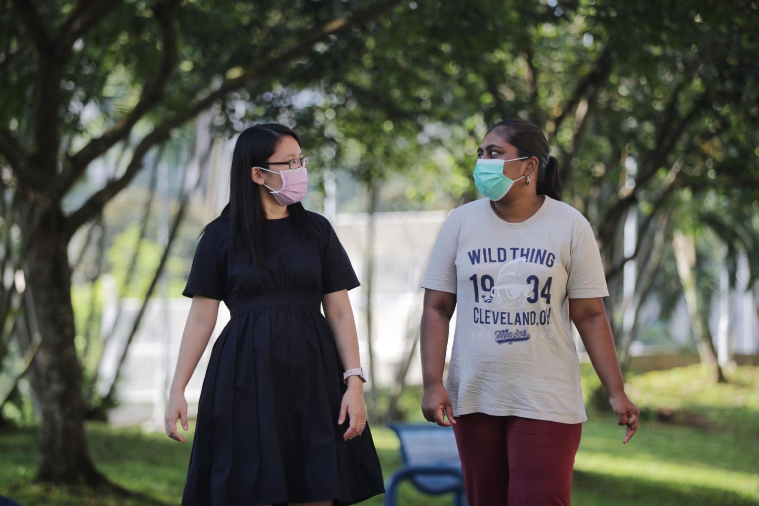 Senior social worker Tay Yu Ping (left) with Ms Shantini Murugiah at Limbang Park during a community walk on April 20, 2021.