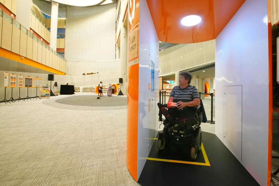 Ms Judy Wee, 61, an accessibility consultant and a member of NLB’s Persons with Disabilities Advisory Committee, using the Borrow-n-Go passageway to loan books.