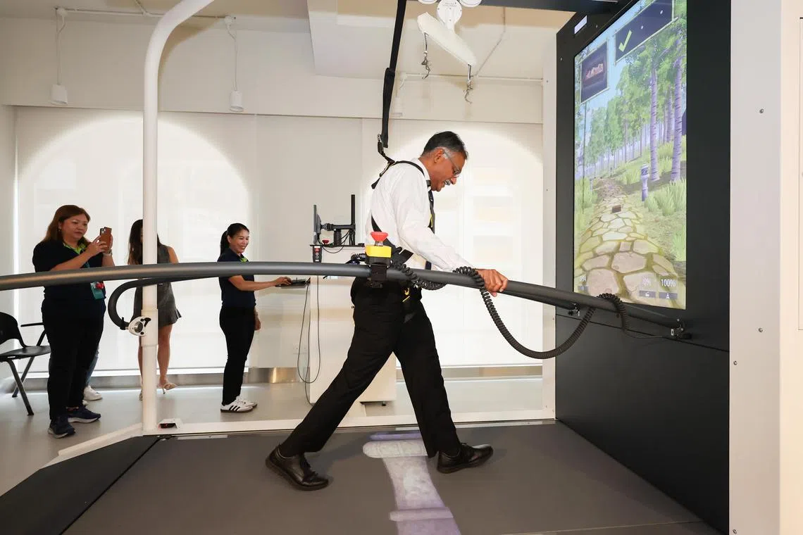 Minister of State for Law and Transport and Bukit Batok MP Murali Pillai using the C-Mill machine, which helps to strengthen the user’s legs, and has different types of gamified therapy plans.