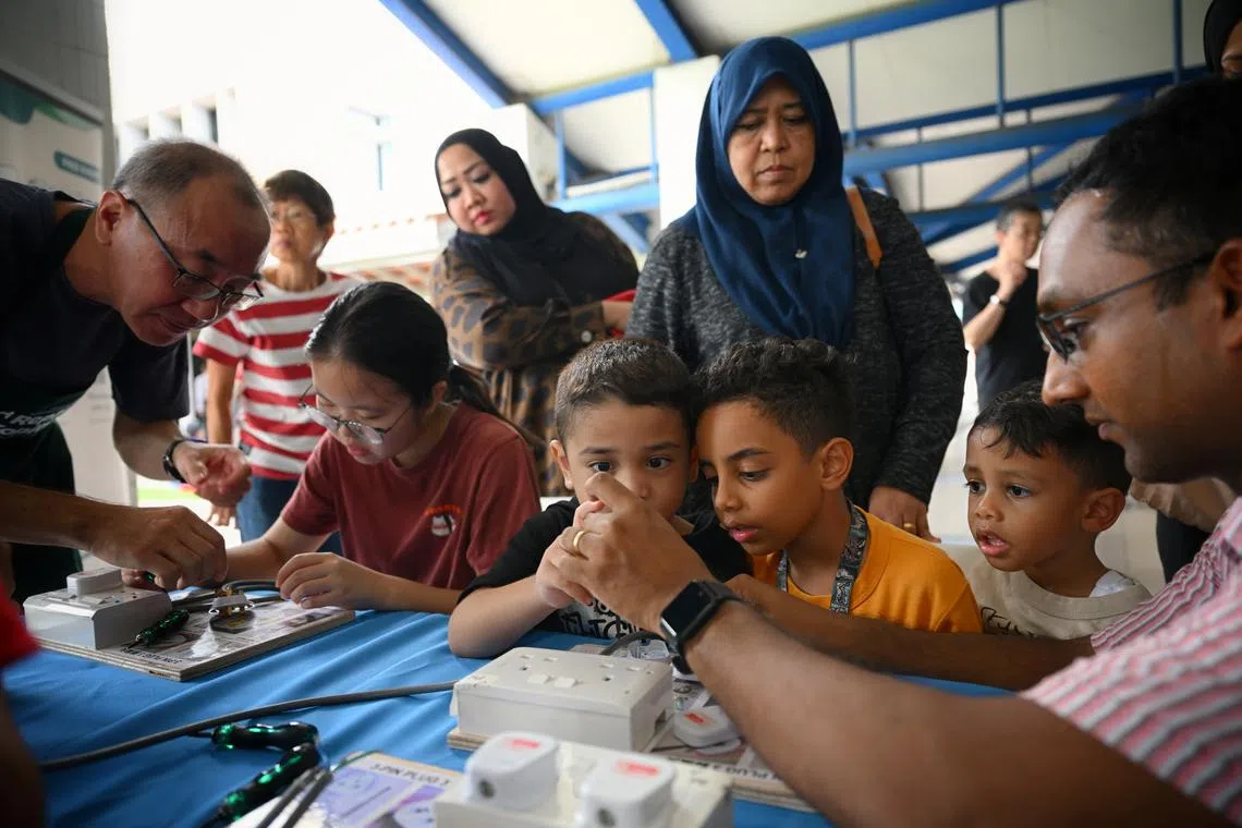 Children learning to repair the components of a three-pin plug at the repair clinic at Tampines Bus Interchange on Oct 26.