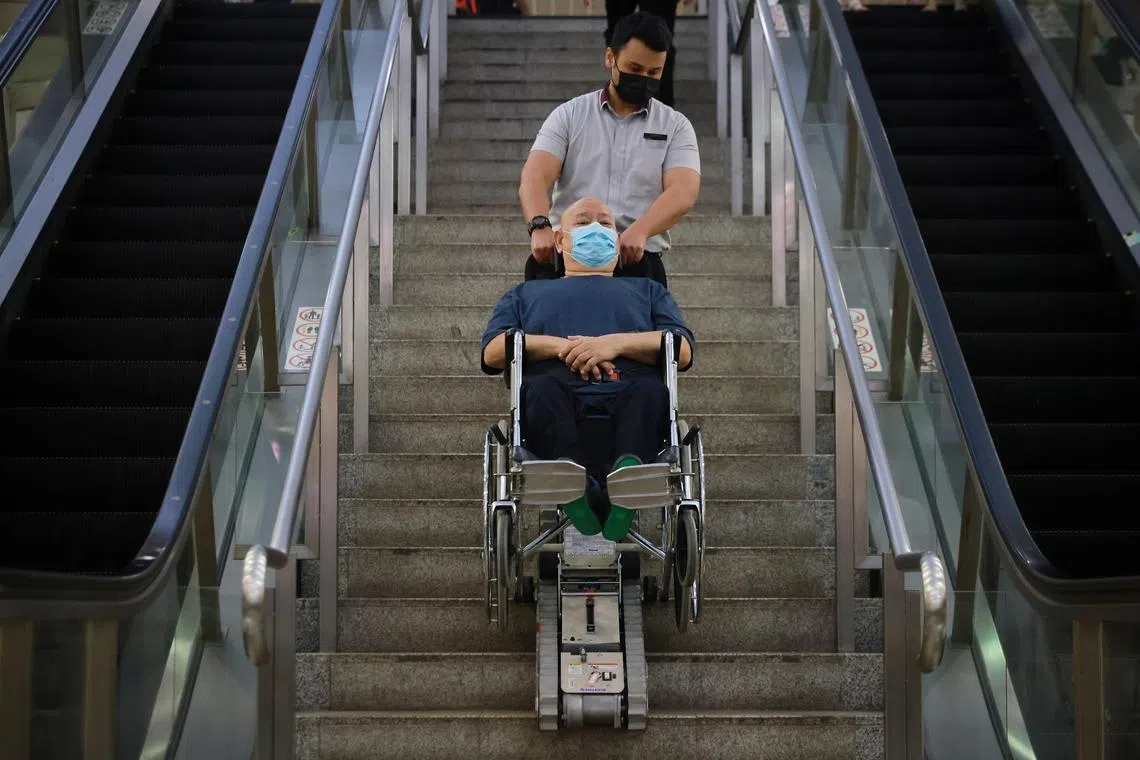 To provide greater accessibility to wheelchair users, SBS Transit also launched a portable stair climber at the NEL platform at Outram Park station on Monday. The equipment allows station staff to move a manual wheelchair up or down a flight of stairs in case of lift breakdowns.