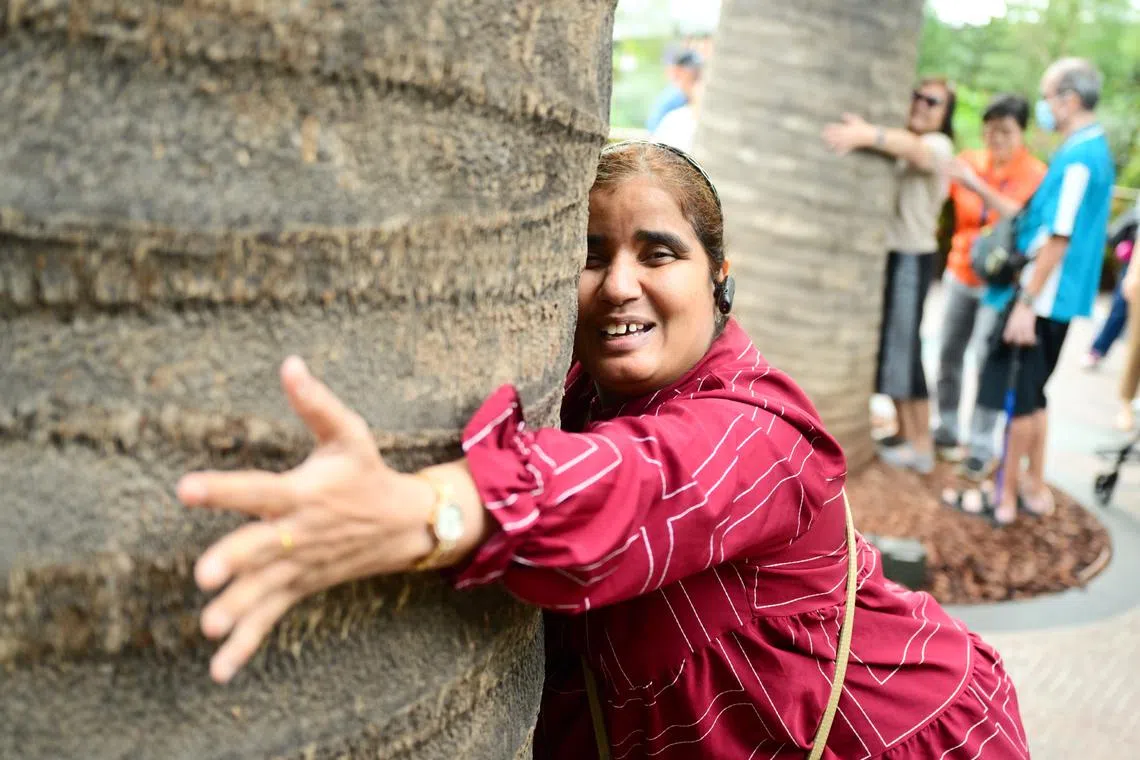 Sharifah Talhah, 58, a homemaker, hugging the trunk of a Chilean wine palm at Gardens by the Bay’s Flower Dome during the new nature tour for the visually impaired on Oct 8.