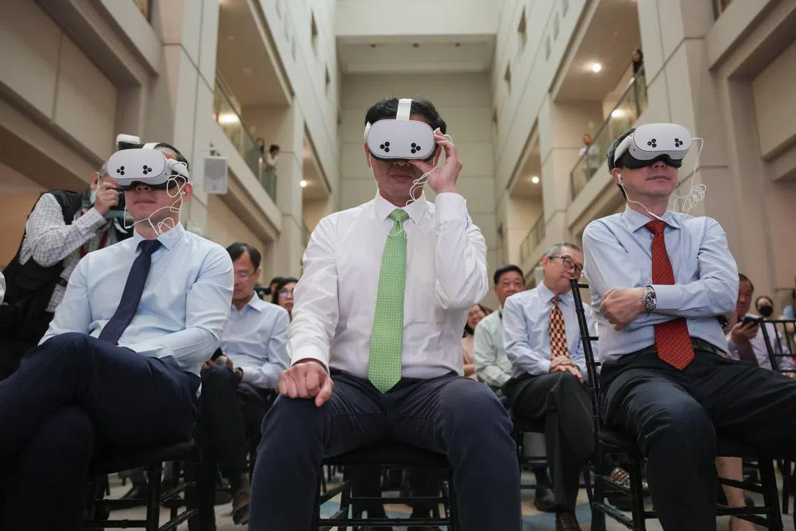 Health Minister Ong Ye Kung (centre) watching the virtual reality simulation of the proposed medical tower at the unveiling of the second phase of the HealthCity Novena Master Plan.