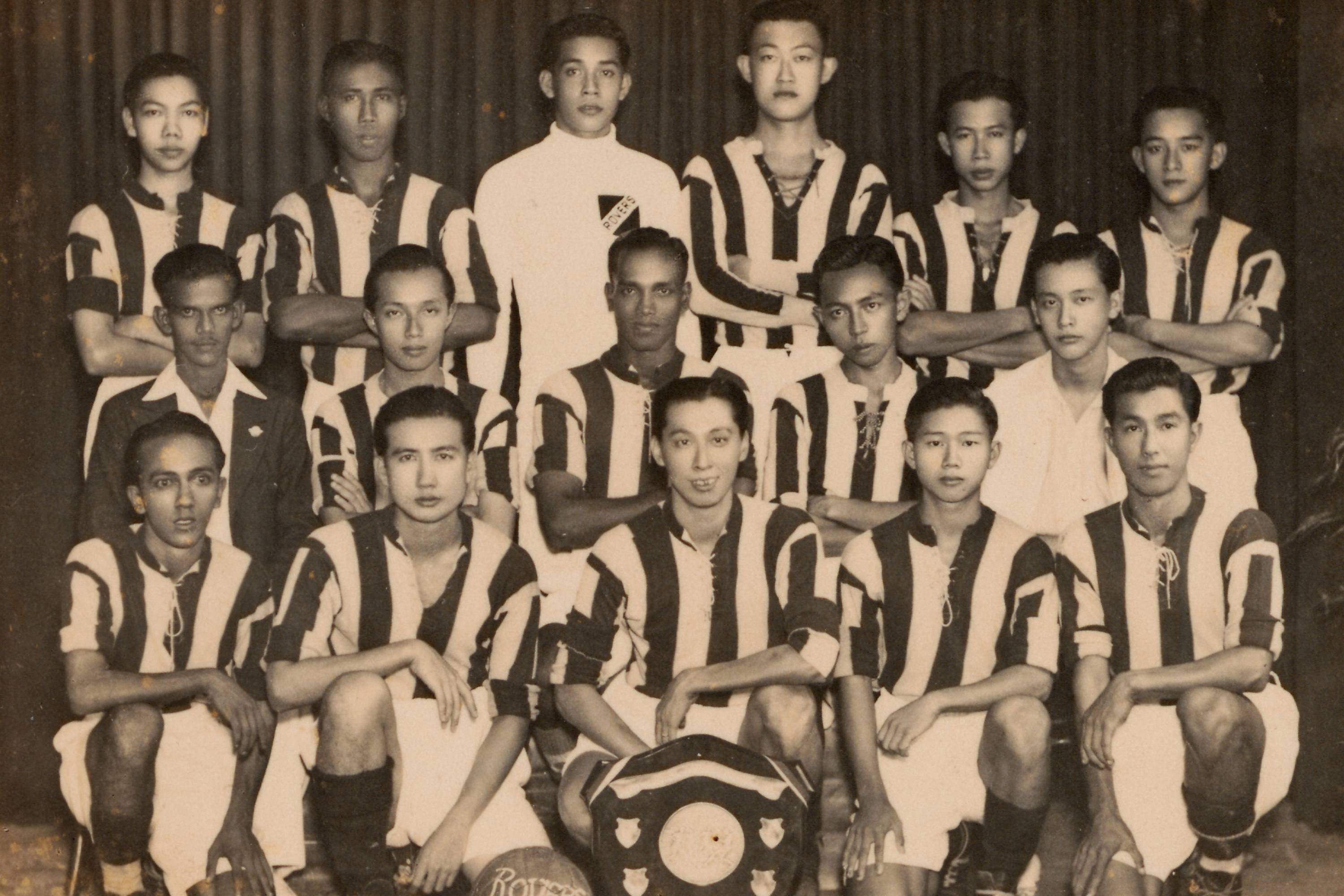 Pasir Panjang Rovers football team after winning the Alsagoff Shield in the Syonan Sports Association Soccer League in 1943.