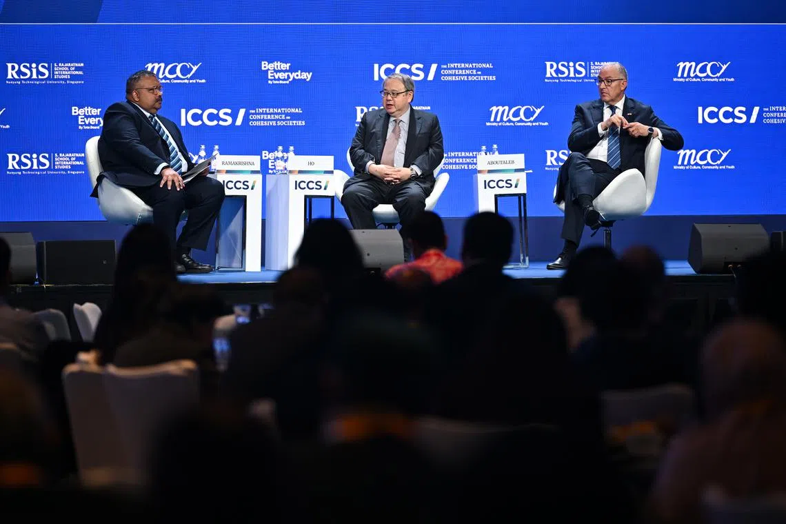 (From left) S. Rajaratnam School of International Studies dean Kumar Ramakrishna, Centre for Strategic Futures senior adviser Peter Ho and Rotterdam’s former mayor Ahmed Aboutaleb speaking at Plenary #2 on Navigating Uncertainty during day two of ICCS.