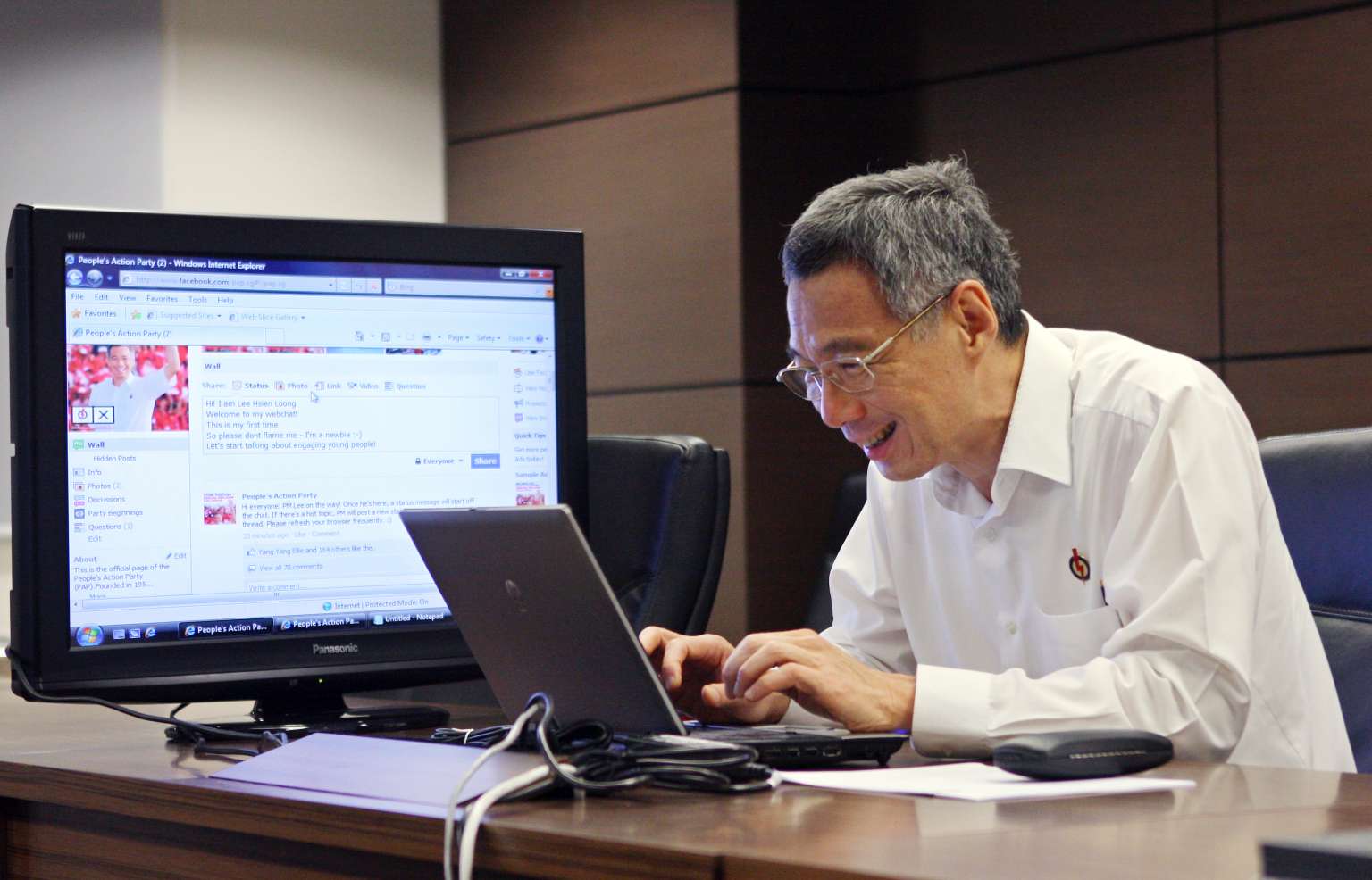 Prime Minister Lee Hsien Loong chatting online with netizens on Facebook, a social networking website, at the People's Action Party headquarters on May 4, 2011.