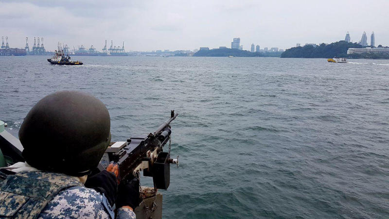 A member of the Republic of Singapore Navy keeps watch as navy ships patrol the waters around Sentosa during a summit between US President Donald Trump and North Korean leader Kim Jong Un on June 12, 2018.