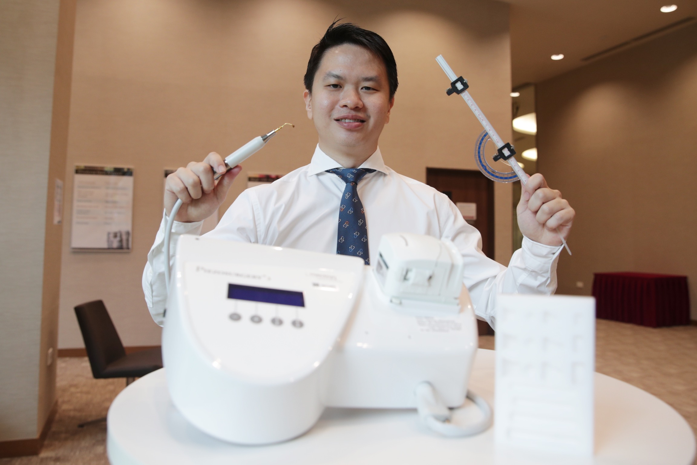 For surgical instruments, he has devised a "rhinoscale" - a measurement device to better calculate the angle of nasal septum deviation, should the wall separating the nostrils be significantly displaced to one side. The prototype is being developed with the National University of Singapore.