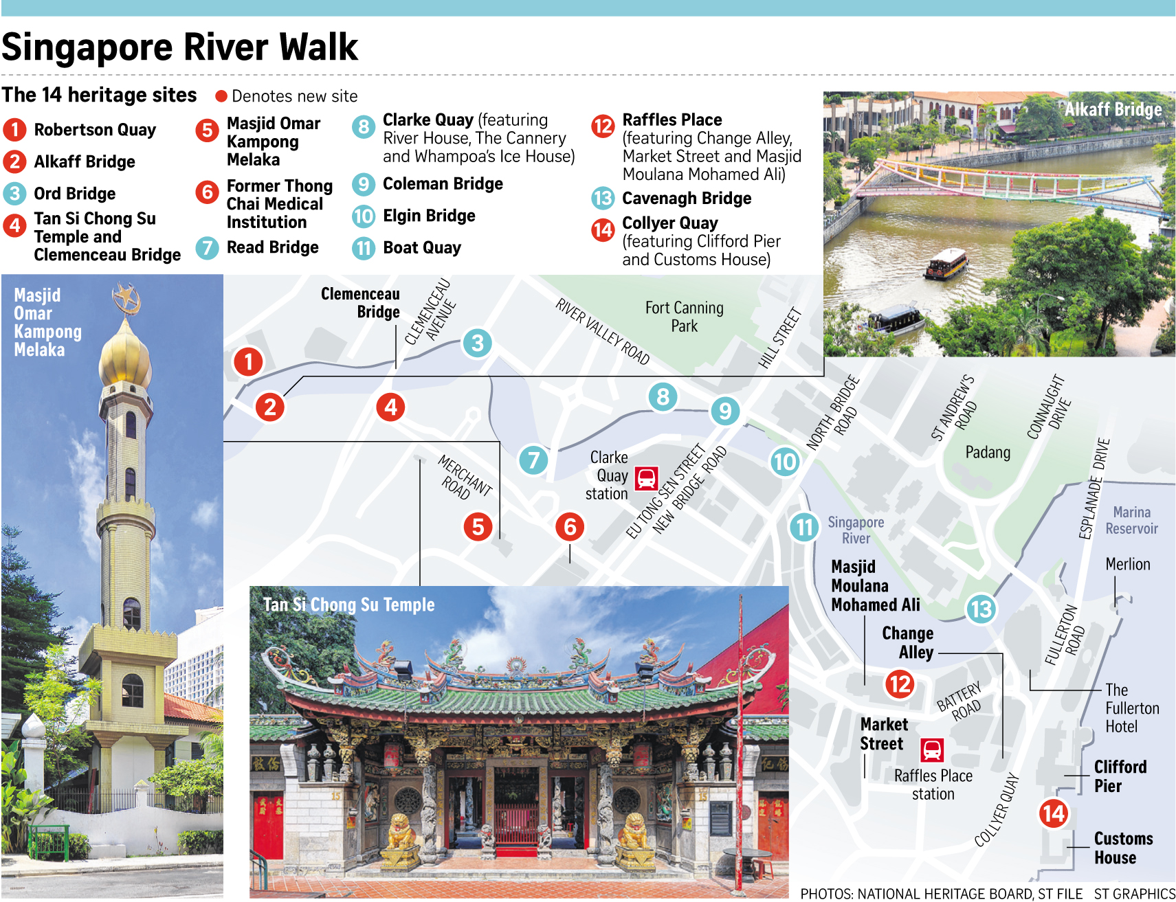 Those who walk along the route - an updated version of a previous trail launched by NHB in 2005 - can learn of the Singapore River's story through "heritage markers", which are plaques detailing the history of each site. Of the 14 markers, seven are new, including those featuring the clinic and Singapore's oldest mosque and place of worship, the Masjid Omar Kampong Melaka, which was established in 1820.