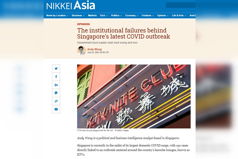A screenshot of a recent opinion piece published by Nikkei Asia on the Government's handling of the Covid-19 cluster.