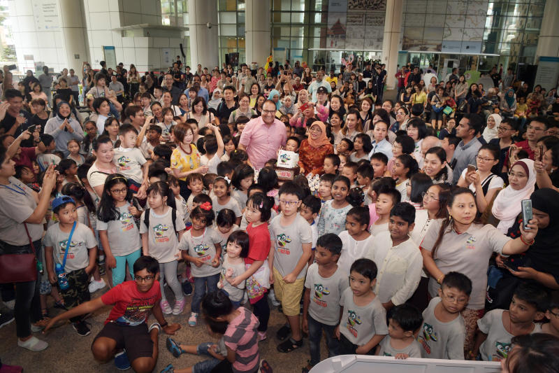 President Halimah Yacob and Minister for Communications and Information S. Iswaran (centre) at a cake-cutting ceremony with about 230 children at the National Library Building.