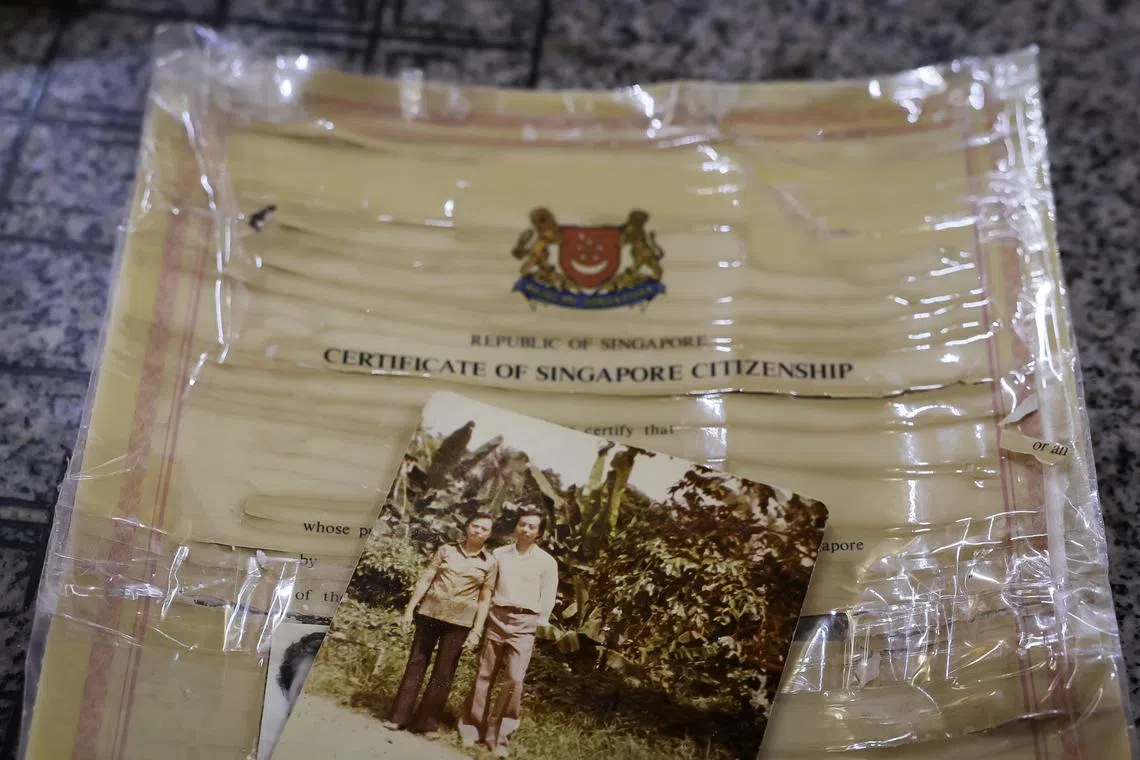 Mr Phua showing a picture of him and his mother, with her Certificate Of Singapore Citizenship during an interview with The Straits Times on July 24.