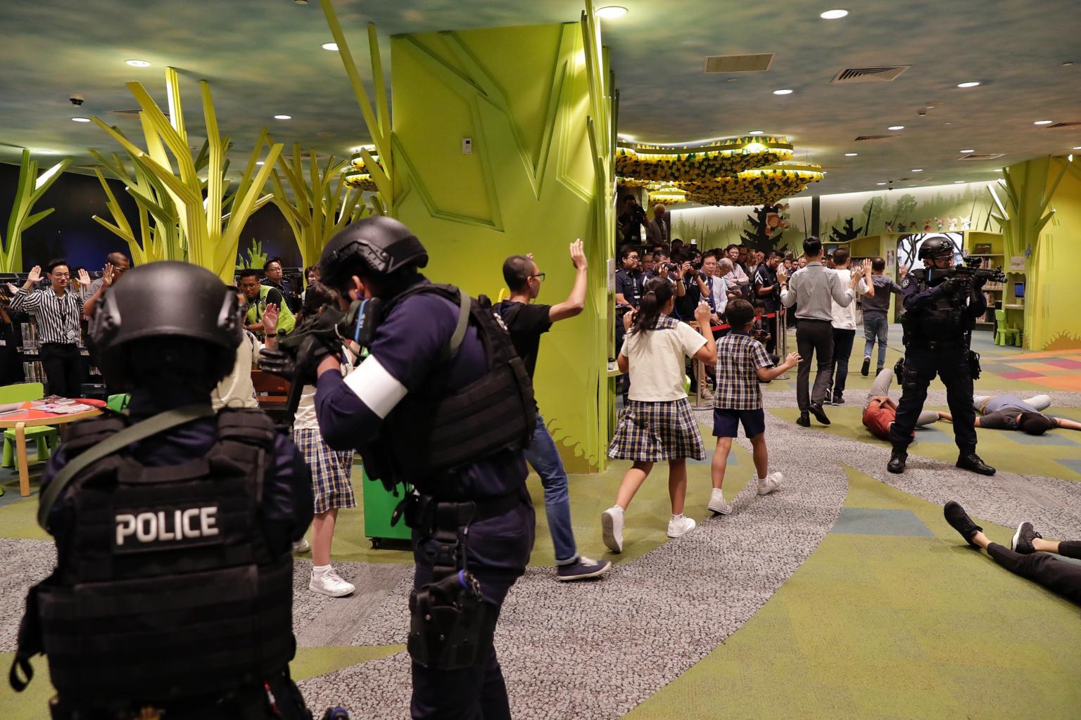 Police ushering people to safety during Exercise Heartbeat at the National Library on Sept 25, 2018.