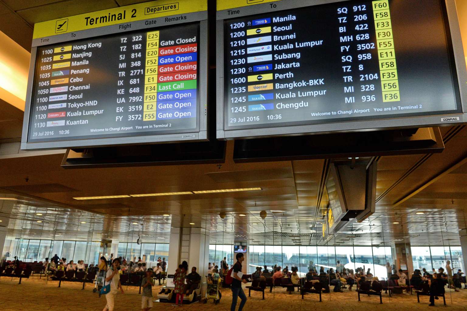 People wait inside a flight departure gate holding area at Changi International airport terminal in Singapore on July 29, 2016.