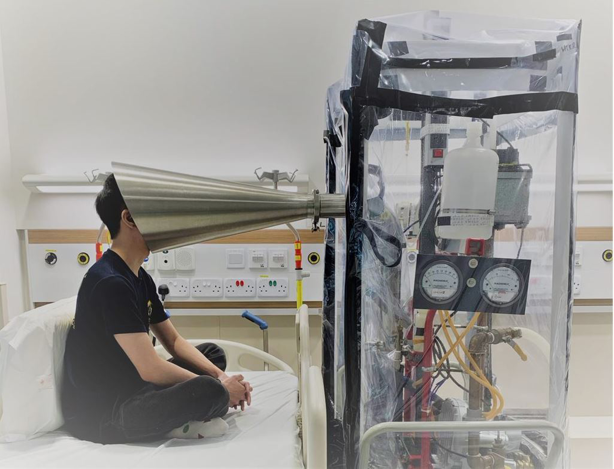 NUS researcher Douglas Tay in a hospital room at the NCID demonstrating how the Gesundheit-II exhalation aerosol particle collection equipment is used.