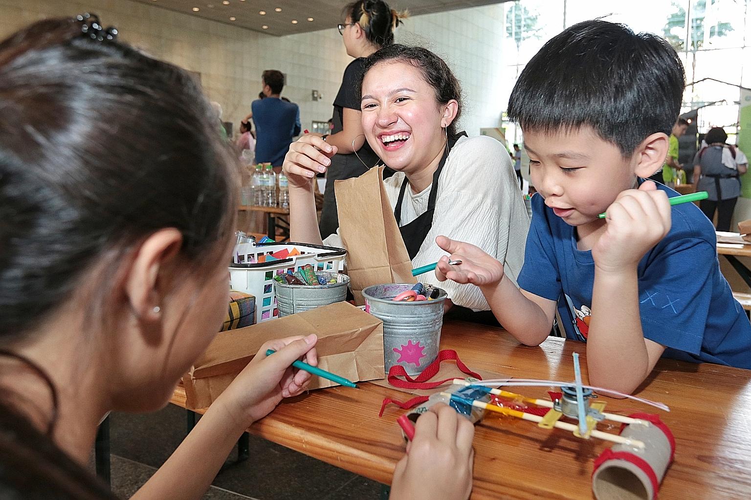 Children having a go at making their own toys yesterday at a booth of the charity group, Playeum, one of the participants in the Singapore International Foundation's (SIF) inaugural Bazaar for Good, held at the ground-floor plaza of the National Library. The bazaar, which ends today, features an exhibition of the SIF's milestones, as well as a showcase of local and regional social enterprises where members of the public can buy items to support their causes. President Halimah Yacob, who launched the event yesterday, said in a Facebook post that it brought together local and international communities to create a positive social impact, which she noted was necessary in tackling issues ranging from sustainable development to fostering inclusiveness.