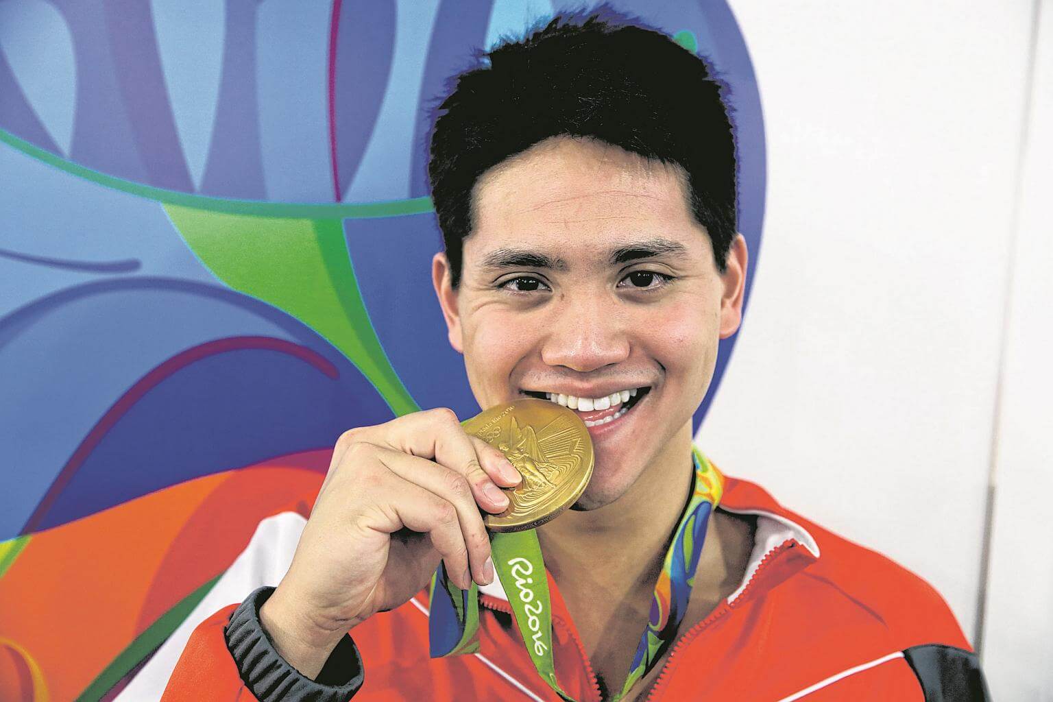 Joseph Schooling posing with his gold medal after winning the Rio 2016 Olympic Games men's 100m butterfly final, on August 12.