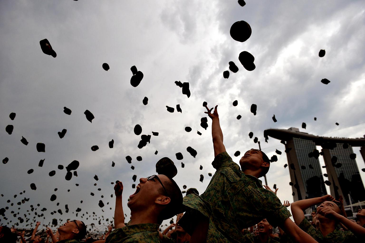 Soldiers throwing their jockey caps in the air to celebrate the end of their basic military training on April 12, 2014.