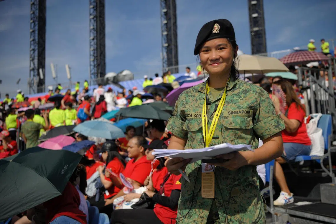 They include Second Lieutenant Soo May Yee, 22, who is the overall-in-charge at the seating gallery, ensuring that up to 27,000 spectators are seated on time and in an orderly manner.