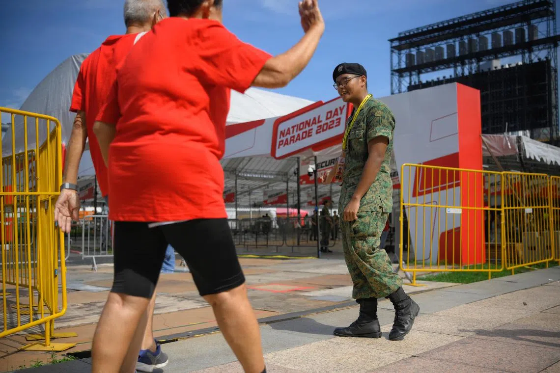 Lance Corporal Muhammed Azly, a priority lane usher at NDP 2023, helping to guide members of the public at the Padang on July 22, 2023.