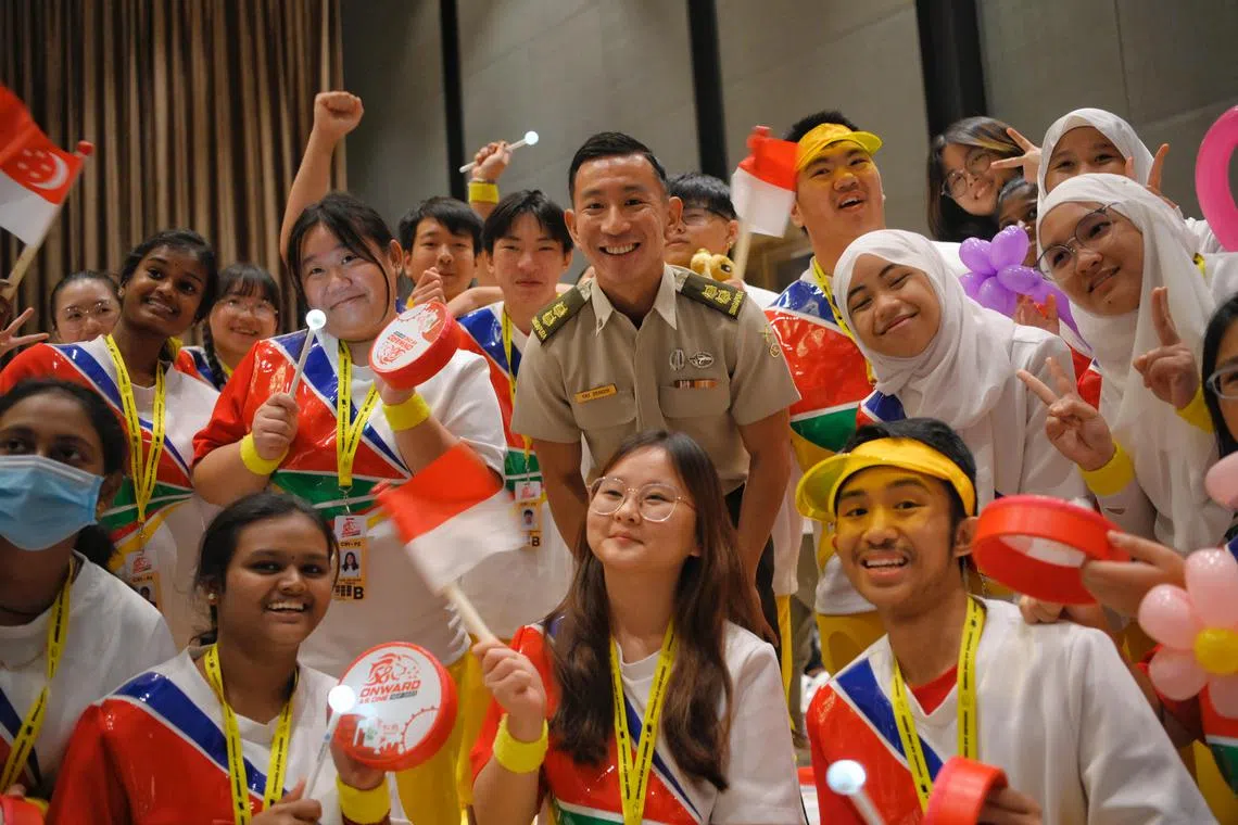 Lieutenant-Colonel Tay Zengyi (centre), the chairman of show support for NDP 2023, with parade participants from various institutes of higher learning on July 22, 2023.