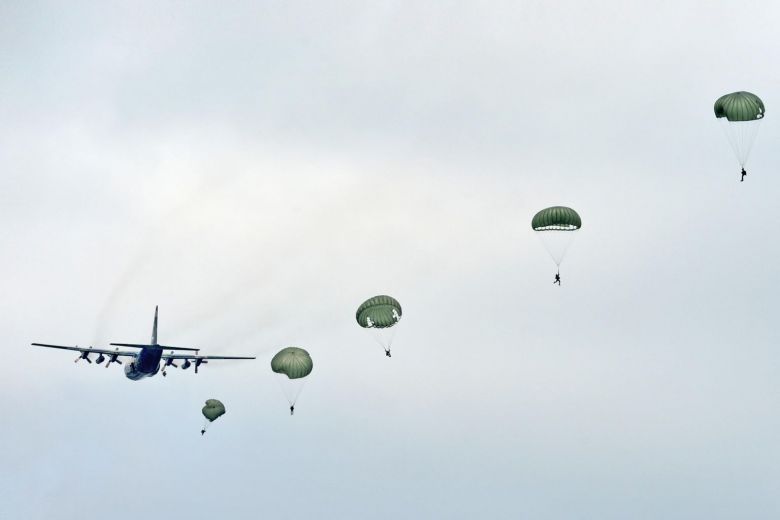 In a photo taken on May 14, 2013, a string of parachutes bloom behind the C-130 Hercules.