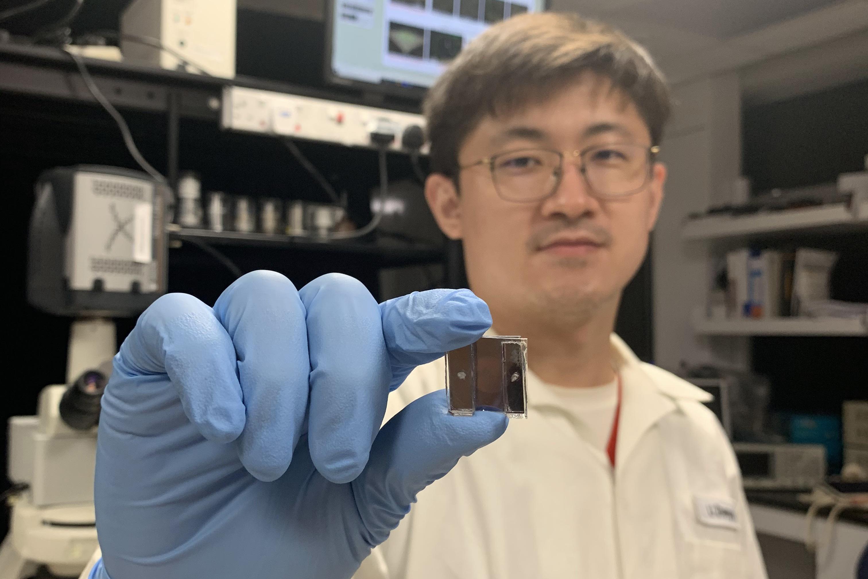 NTU’s School of Electrical and Electronic Engineering research fellow Li Zhenyu holding up the NTU-invented digital virus manipulation chip.