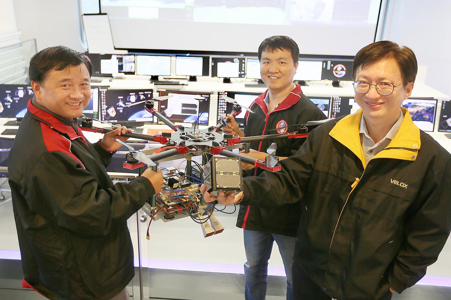 Project lead Professor Lu Yilong (left) and senior research fellow Liu Weixian (centre) carry the drone carrying the prototype of the synthetic aperture radar, while NTU Satellite Research Centre director Lim Wee Seng holds a microsatellite that the radar can be attached to for launching into space.