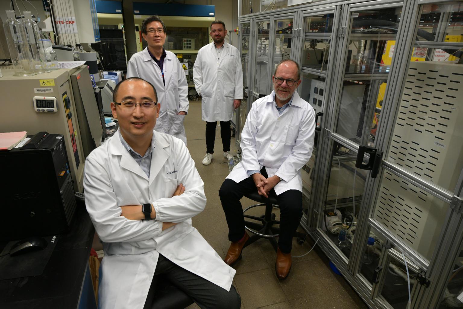 The NTU team includes (clockwise from lower left) Assistant Professor Paul Liu from the School of Chemical and Biomedical Engineering; Professor Lim Teik Thye from the School of Civil and Environmental Engineering; Assistant Professor Grzegorz Lisak, director of the Residues, Resource and Reclamation Centre at the Nanyang Environmental and Water Research Institute; and Professor Simon Redfern, dean of the College of Science.