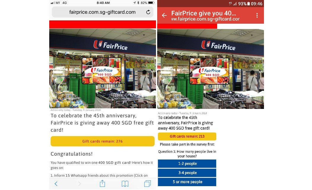 That scam offered $1,000 free FairPrice gift vouchers with an unverified link via WhatsApp.