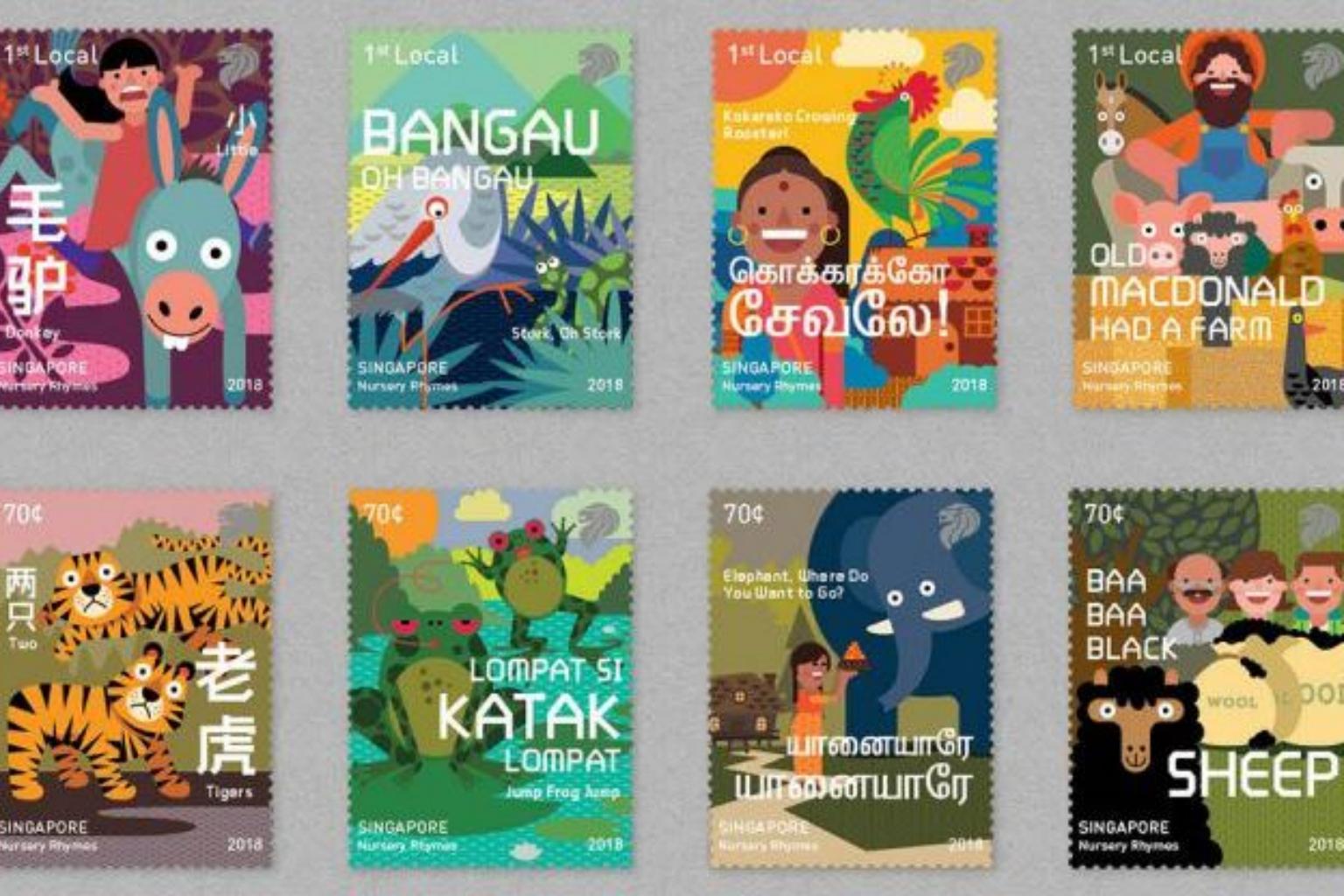 The stamp collection, which won the top prize in the graphic design category, features characters from English, Chinese, Malay and Tamil nursery rhymes, such as Baa Baa Black Sheep and Bangau Oh Bangau.