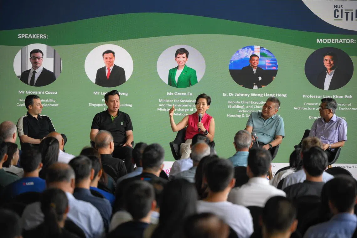 Moderated by Dr Lam Khee Poh, the provost’s chair professor of architecture and the built environment at NUS, the panel discussion featured Minister for Sustainability and the Environment Grace Fu, Singapore Green Building Council president Lee Ang Seng, Housing Board deputy chief executive Johnny Wong and CLD’s head of sustainability Giovanni Cossu.