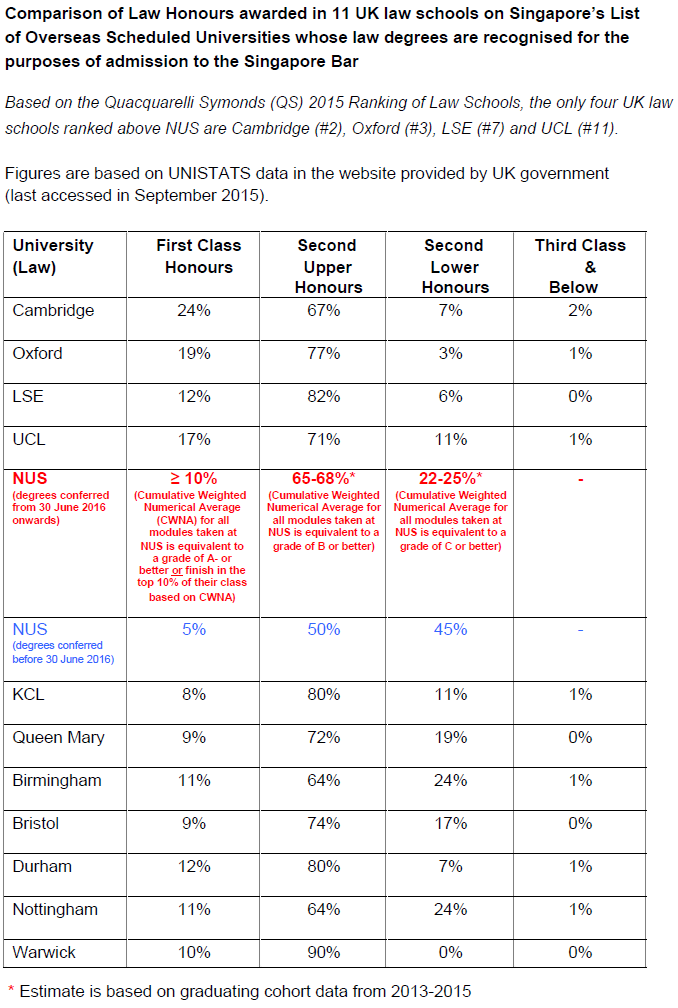He wrote: "Other top law schools with a comparable cohort size, such as Oxford, London School of Economics, and University College London are awarding first class honours in the range of 12 per cent to 24 per cent, and second class (upper division) honours degree in the range of 67 per cent to 82 per cent.
