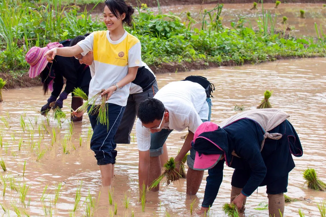 NUS undergraduates Shakura Nuha Bashir (left) and Muhammad Nadjad Abdul Rahim (second from right) helping out at a paddy field in Laos while on their school’s Univeristy Scholars Programme (USP).