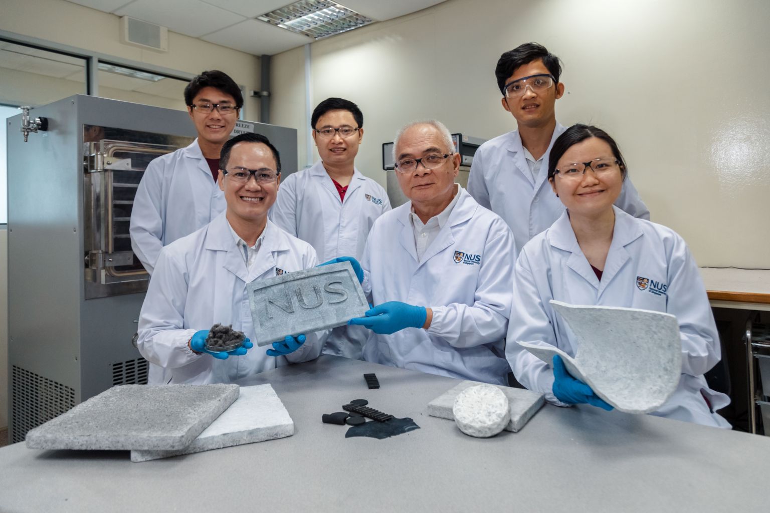 A team of researchers from the National University of Singapore, led by Associate Professor Duong Hai-Minh (front row, first from left) and Prof Nhan Phan-Thien (front row, centre), has developed the world’s first aerogels made from scrap rubber tyres.